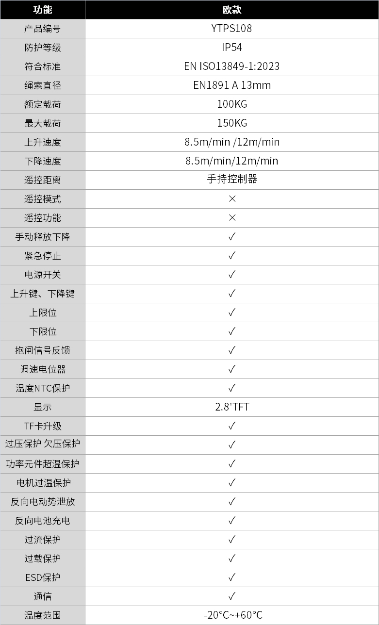 欧款爬绳机 - 珠海研泰科技-爬绳机,电升,电动升降器,电动爬绳机,攀爬机,便携式爬绳器 ,充电式爬绳机,爬升器,爬绳器,爬高器,锂电池电动升降,电力升降机 欧款爬绳机 YTPS108 产品详情介绍: 分享: